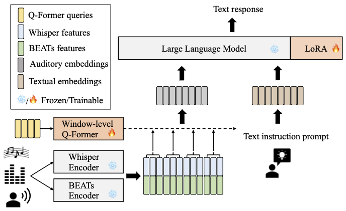 The model architecture of SALMONN is shown below. A window-level Q-Former is used as the connection module to fuse the outputs from a Whisper speech encoder and a BEATs audio encoder as augmented audio tokens, which are aligned with the LLM input space. The LoRA adaptor aligns the augmented LLM input space with its output space. The text prompt is used to instruct SALMONN to answer open-ended questions about the general audio inputs and the answers are in the LLM text responses.